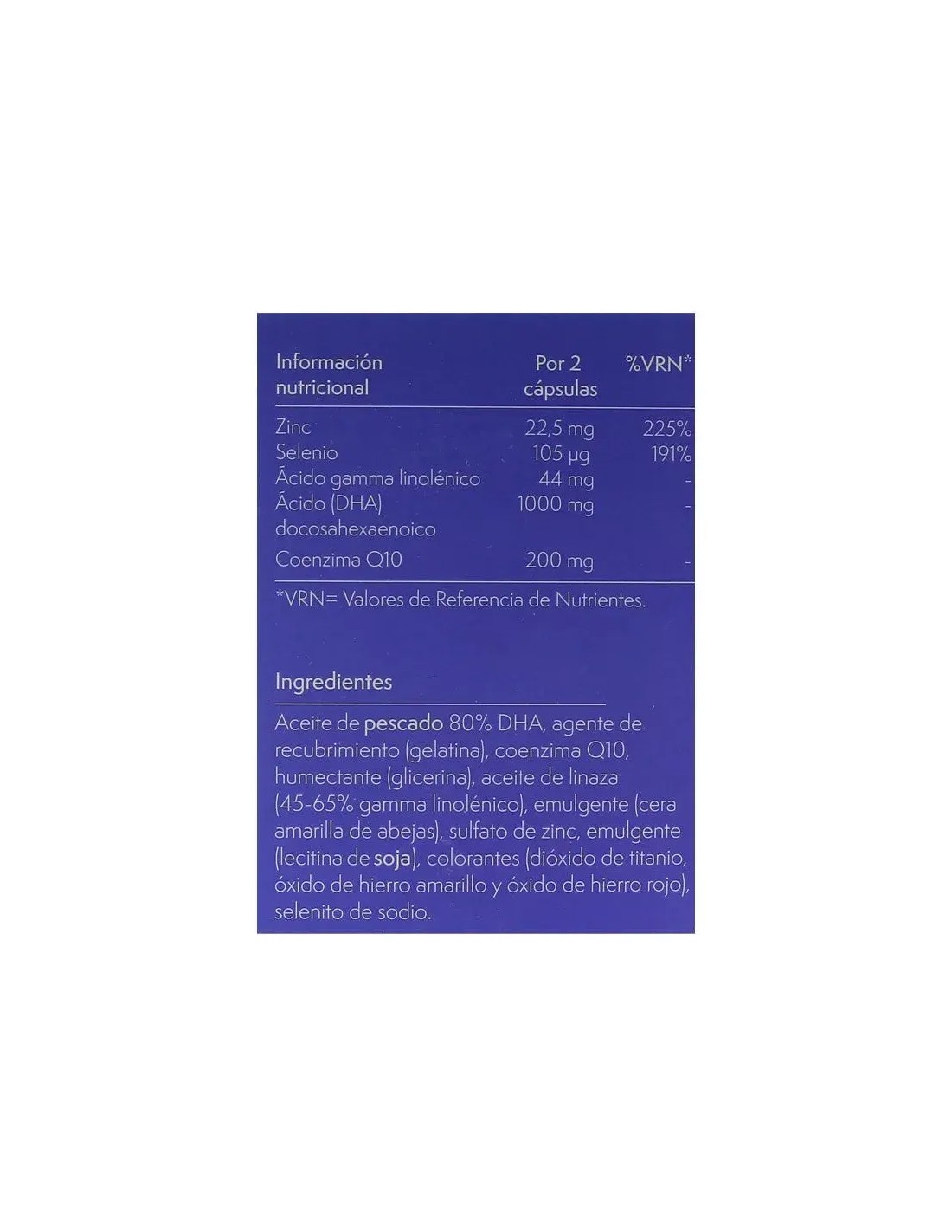 DHA, Omega 3 de alta calidad, que se obtiene de pescados azules de agua frías y limpias. El origen y método de obtención del DHA aseguran un producto de elevada calidad y pureza garantizando la ausencia de posibles contaminantes.