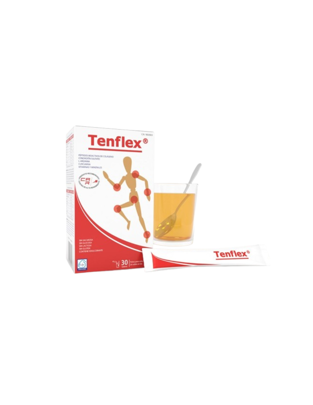 Tenflex es un complemento alimenticio a base de condroitín sulfato, péptidos bioactivos de colágeno y curcumina entre otros ingredientes. Contiene también manganeso, que contribuye a la normal formación de tejido conectivo como tendones y ligamentos.