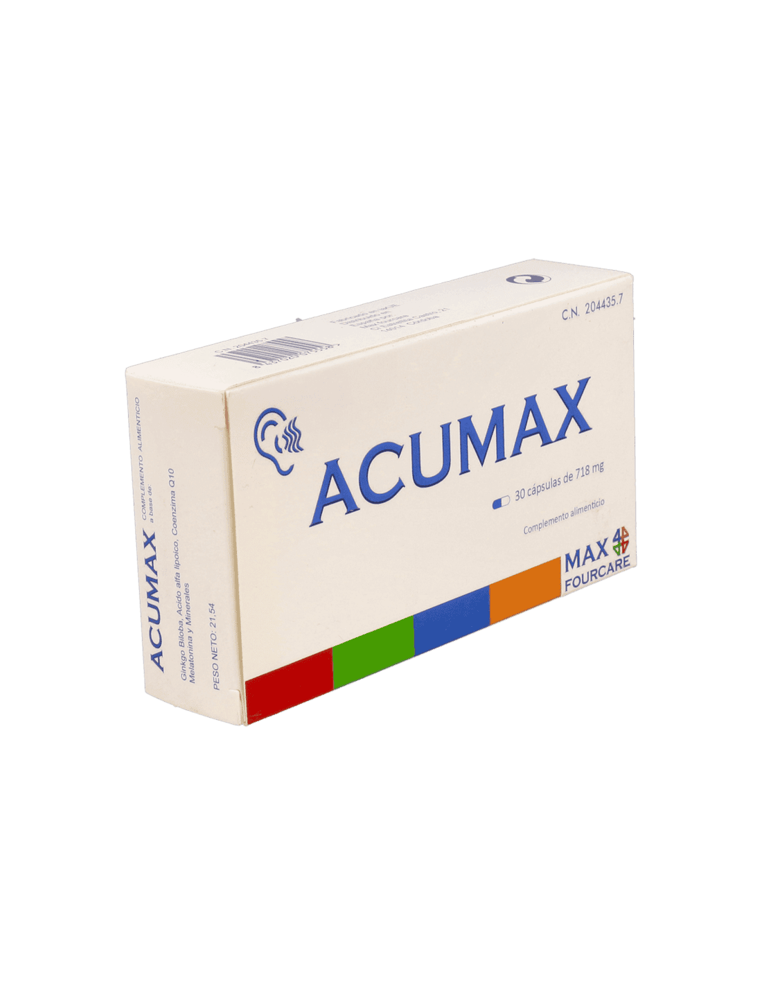 Acumax es un complemento alimenticio que tiene como objetivo apoyar el mantenimiento regular y continuo del sistema auditivo.MODO DE EMPLEOTomar 1 cápsula al día antes de acostarse. Se recomienda mínimo 3 meses de tratamiento.