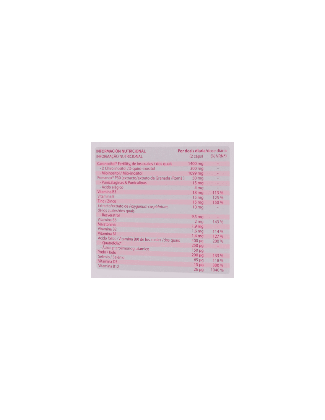 Complemento alimenticio indicado para mujeres en edad fértil para mejorar las posibilidades de concepción. Con caronositol y quatrefolic patentados, resveratrol, extracto de romá y vitaminas D, E y vitaminas del grupo B, zinc, selenio y yodo. Normaliza la fertilidad de la mujer y favorece el crecimiento de la placenta durante el embarazo. Adecuado para mujeres en edad fértil que planifiquen un embarazo y quieran multiplicar sus posibilidades.