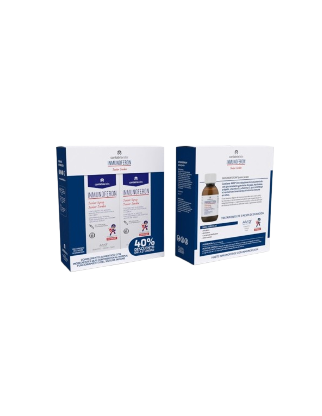 INMUNOFERON Junior Jarabe es una fórmula exclusiva para niños a base de la tecnología AM3® (tecnología patentada por Cantabria Labs con alfa glucomanano fosforilado y proteína de soja) y enriquecido con próspolis y equinácea, además de vitamina C y vitamina D, que contribuyen al normal funcionamiento del sistema inmune en niños.