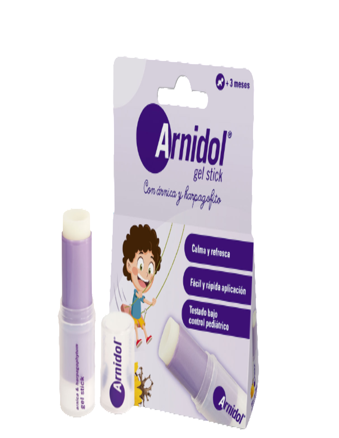 Arnidol gel stick, gracias a sus ingredientes, Árnica y Harpagofito, de origen natural; refresca y reconforta la piel después de los pequeños golpes de los niños.