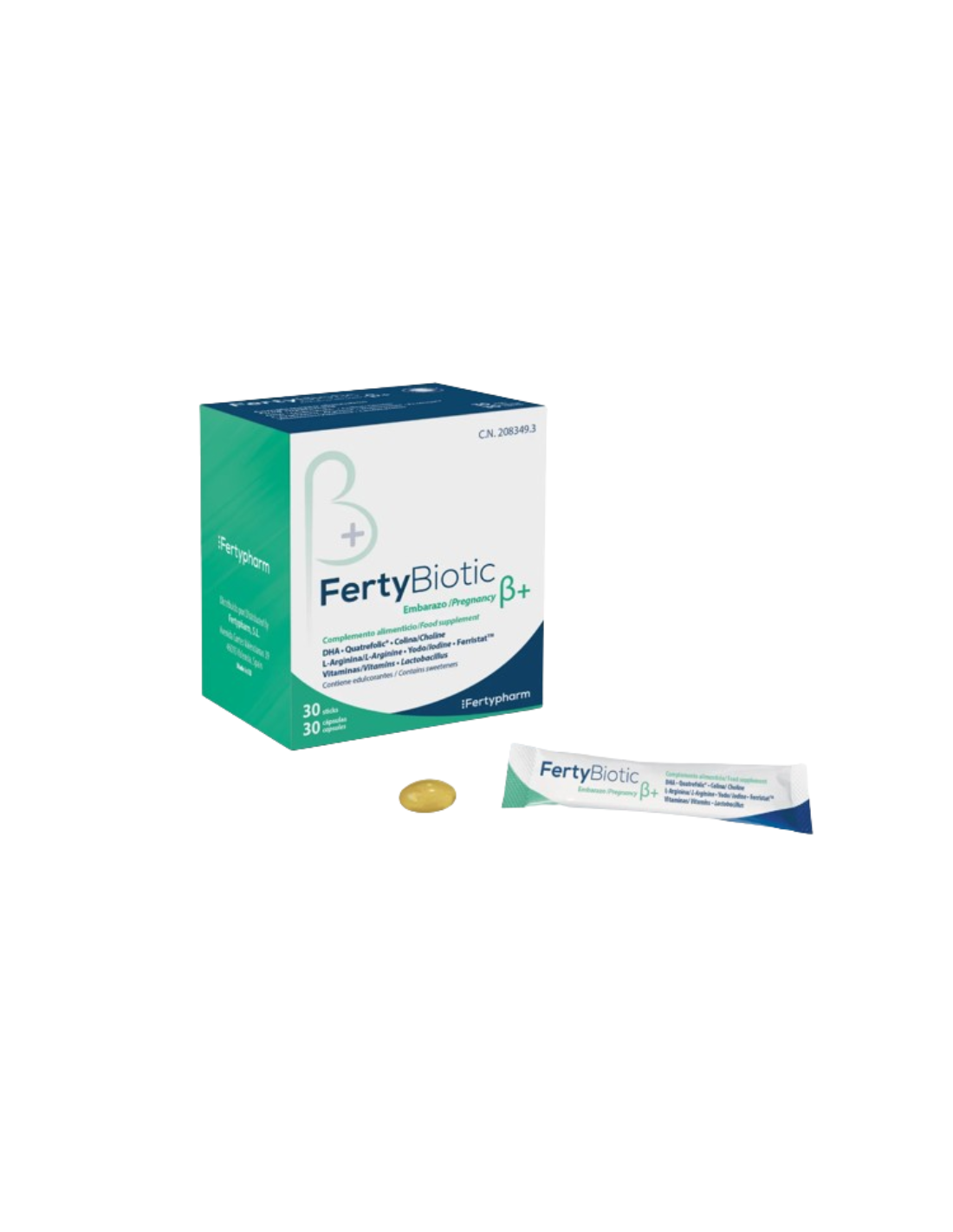 FertyBiotic Embarazo ß+, la fórmula más completa, donde incorporamos componentes innovadores como la L- Arginina y Colina y los probióticos Synbalance® EnjoyMum de alta calidad (Lactobacillus gasseri y acidophilus) y de aplicación en embarazo.