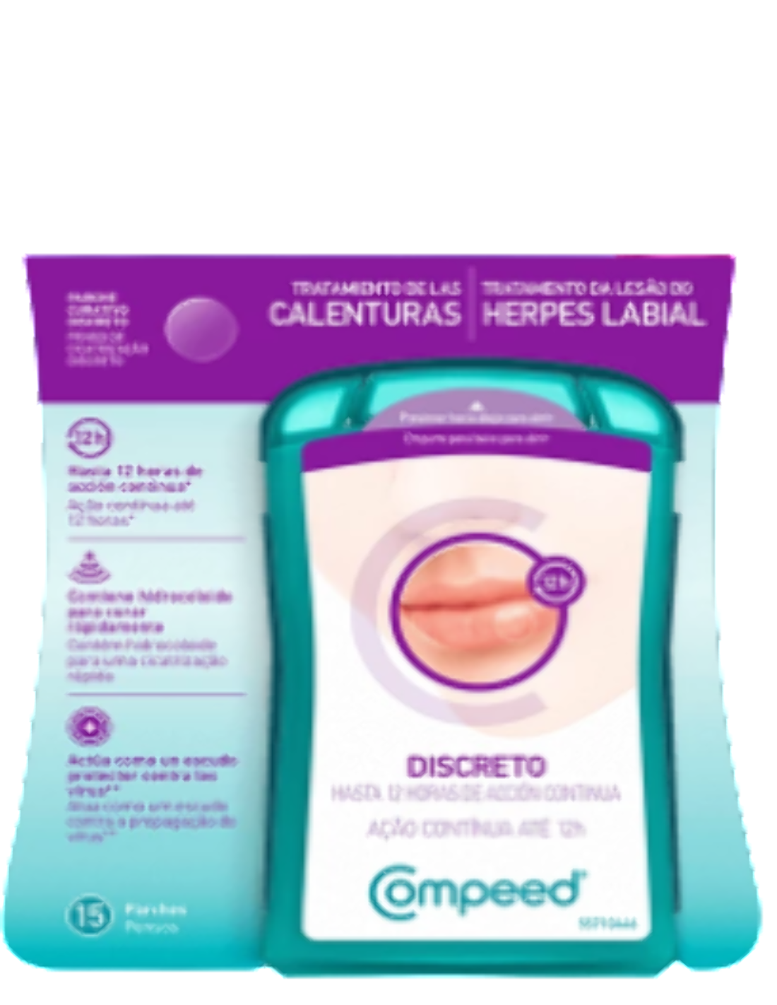 Compeed Calenturas Total Care es el primer parche invisible para el control de los síntomas del herpes labial. Su tecnología hidrocoloide-075 es un gel activo que actúa como una segunda piel. Sella la calentura acelerando el mecanismo de regeneración natural de la piel.