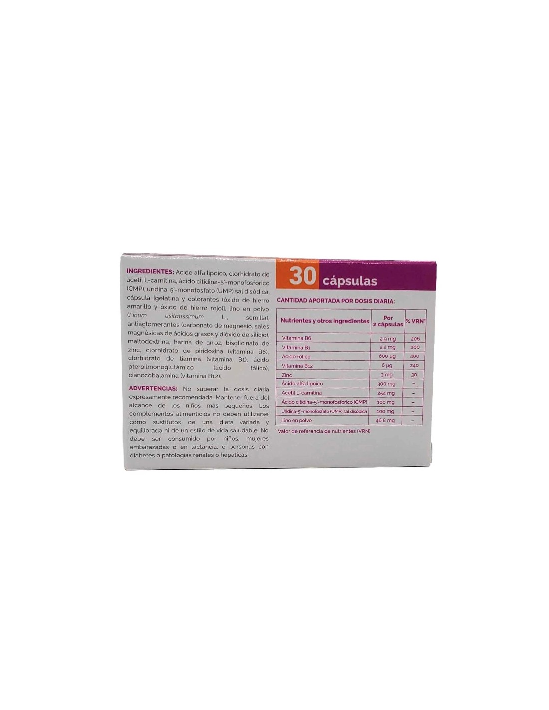 Nucleótidos CMP + Uridina: componentes tradicionalmente relacionados con la recuperación y maduración axonal del tejido nervioso, ya que favorecen la regeneración de la vaina de mielina, mejoran la conducción del impulso nervioso y el trofismo muscular
