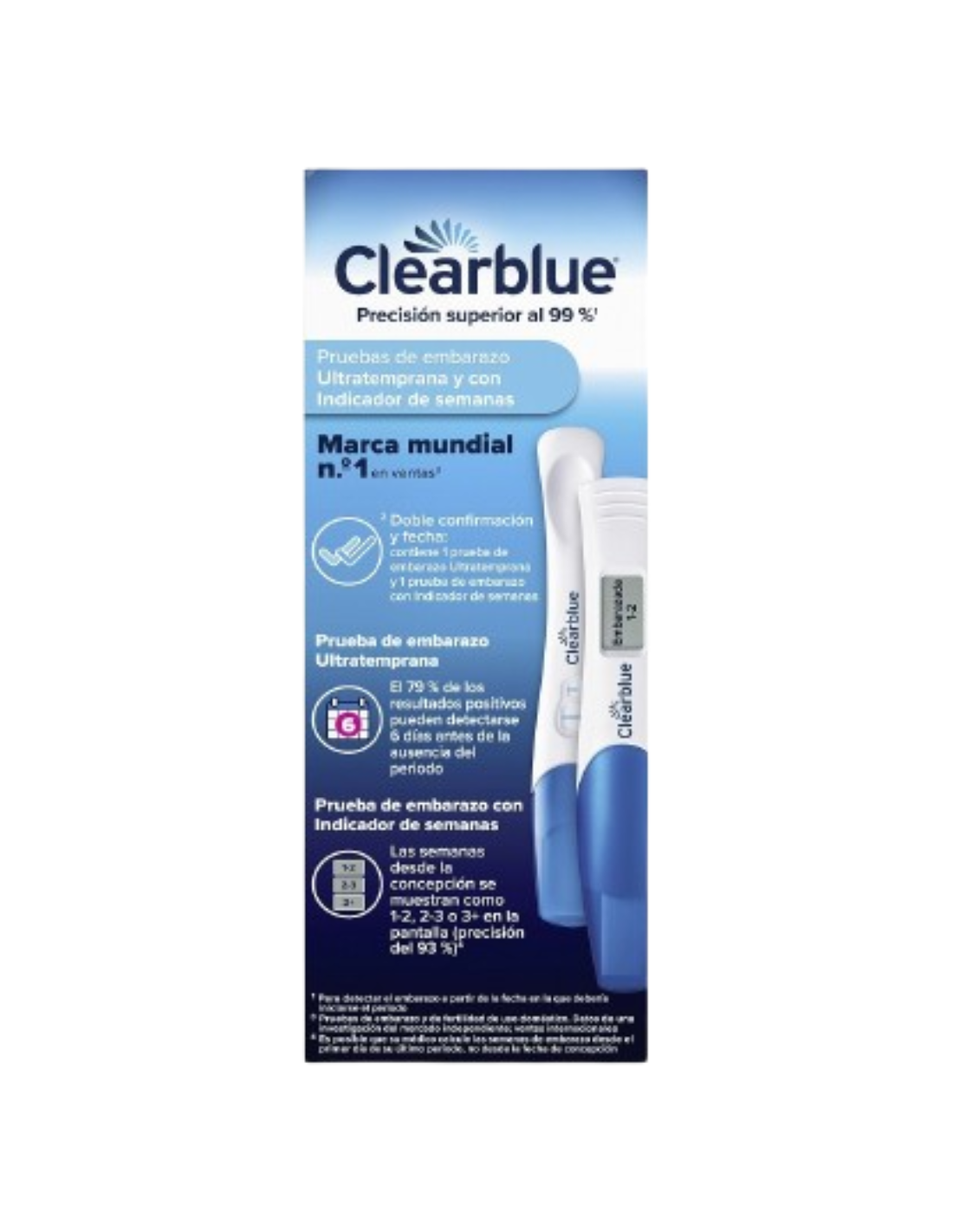 Este Clearblue te ofrece una doble confirmaicón y fecha. Contiene 1 prueba de embarazo ultratemprana y 1 prueba de embarazo con indicador de semanas.